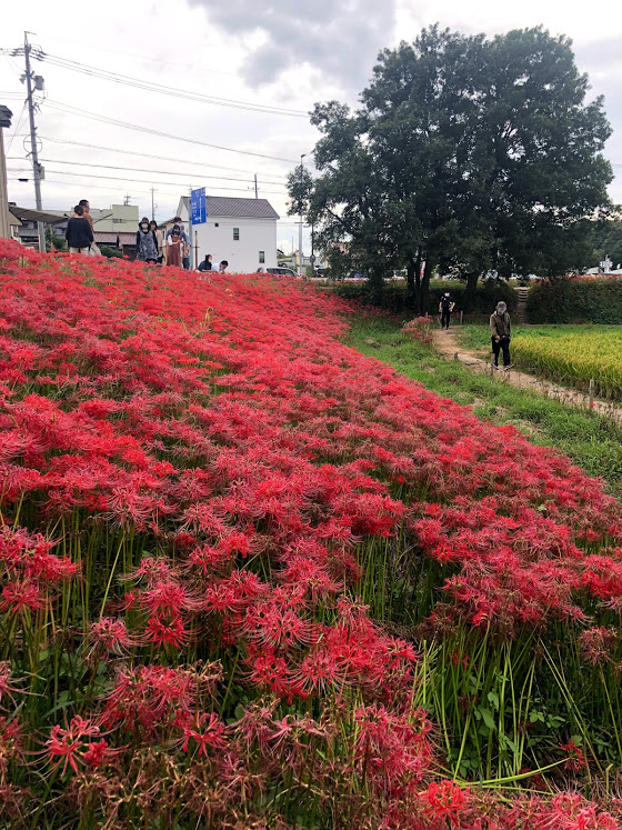 なだらかな山と田畑が広がる中に咲く彼岸花は、赤い帯や絨毯になって広がっています。場所によっては花の終わっているところもありますが、十分に楽しみながら散歩できます。
