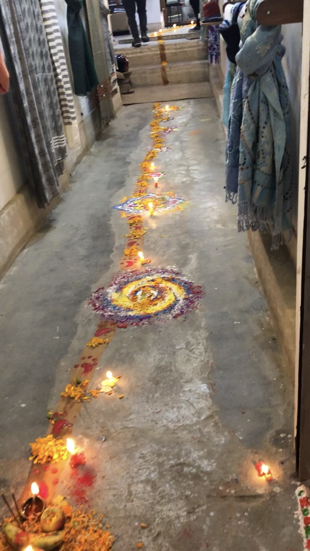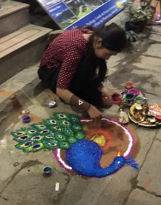 ティハールの前夜祭は店先や道路などに色粉で絵を描いて絵にろうそくを置いて火を灯して飾ります。私の友達のAちゃんは、ネパール人のRさんと結婚して、タメル地区でパシュミナなどを売るお土産屋さんを営んでいます。この日は、お店の中で色粉の絵を描くのを手伝わせてもらいました。道具などは使わず手で粉をまいて描いていきます。