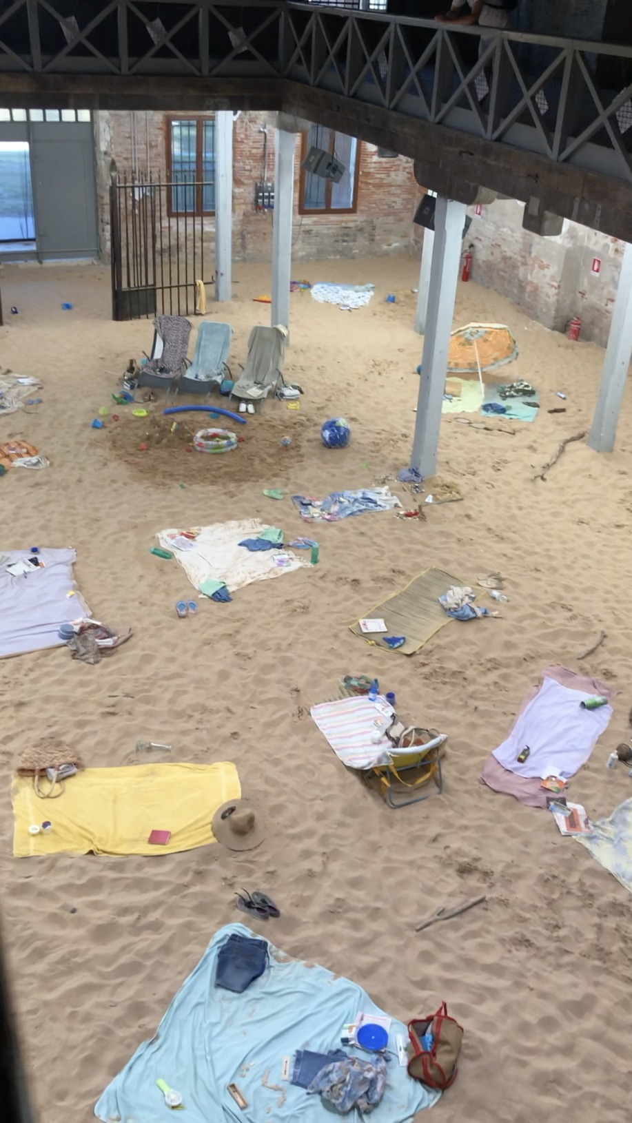 こちらは、メイン会場外の金獅子賞を取ったパビリオンです。環境問題をテーマとした15分くらいのオペラ仕立ての作品だそうです。私たちが行ったときは当日の上演は終わっており、敷き詰められた砂の上にビーチパラソルや浮き輪などが置いてあって、奇妙な音楽が流れていました。