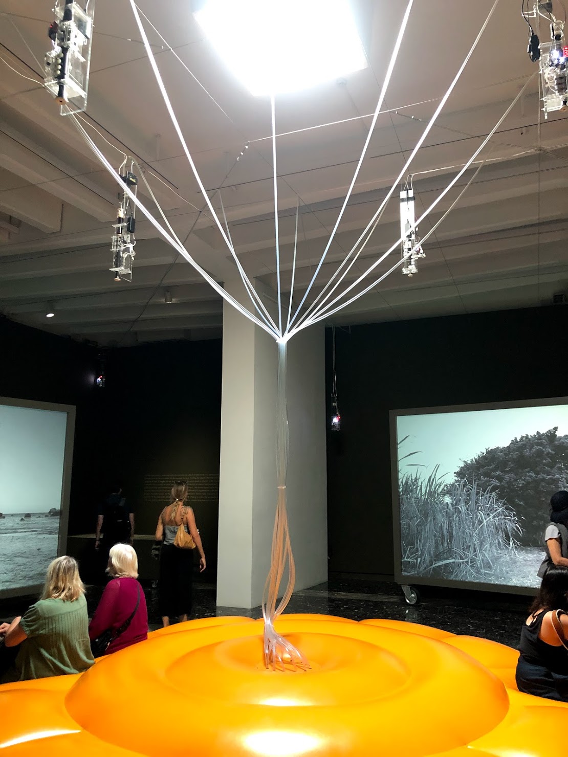 日本館では、巨大な風船みたいなソファから、管を通してときどき上にぶら下がったリコーダーに空気が送られて、ピーッとかボーッと音が出る作品が展示されていました。