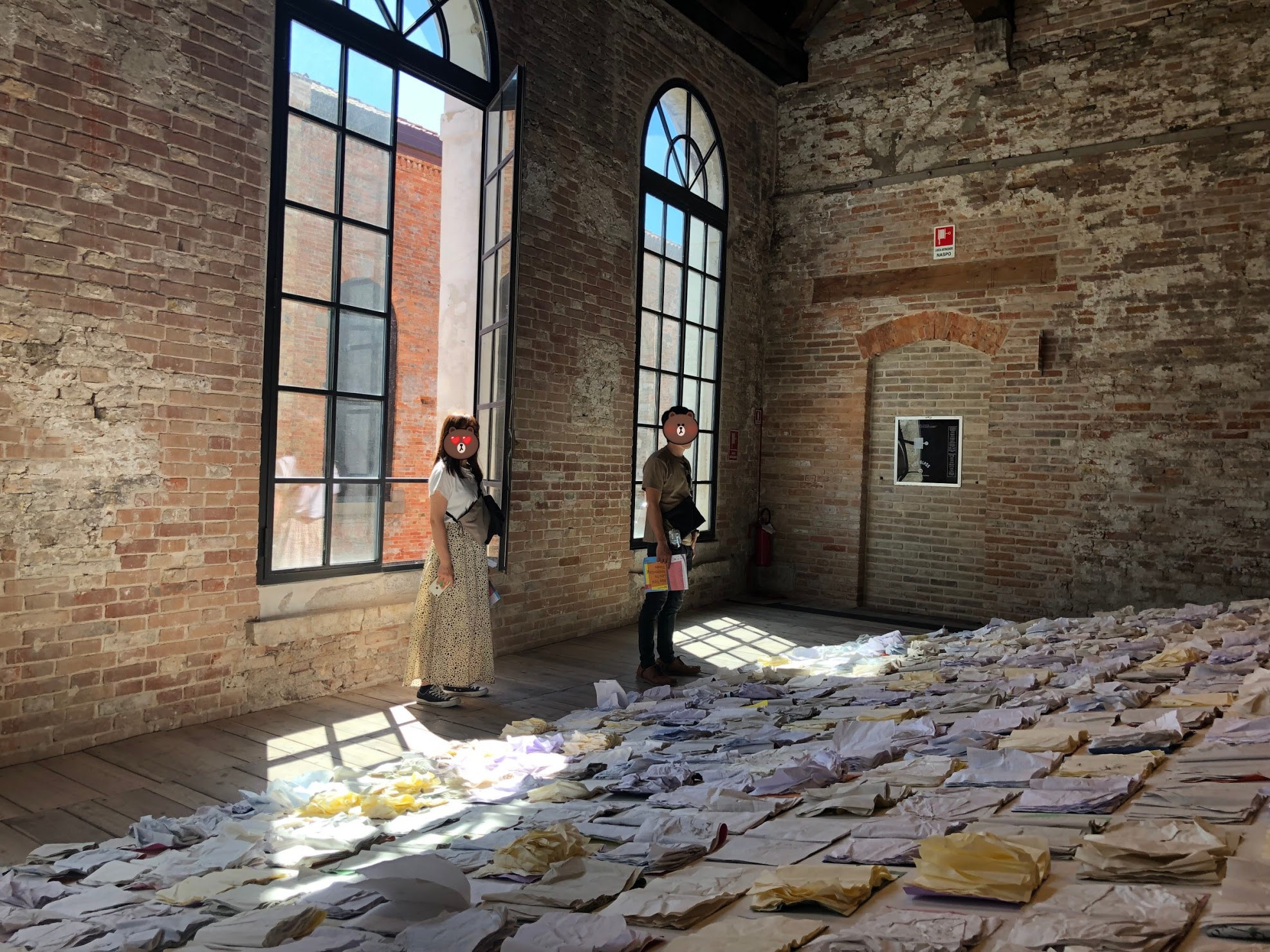 アーセナルだけでも広大な敷地で一日でも見きれないほどの作品があります。画像の作品は、川や海の水にノートを晒して乾かしたものを並べてあり、一辺が10メートルくらいあります。ここでは、世界各国からキューレーターに選ばれた作家の作品を見ることができます。建物自体が何百年も経っているので、作品の非日常性と相まって、自分も作品の中に溶け込んでいくような気がします。