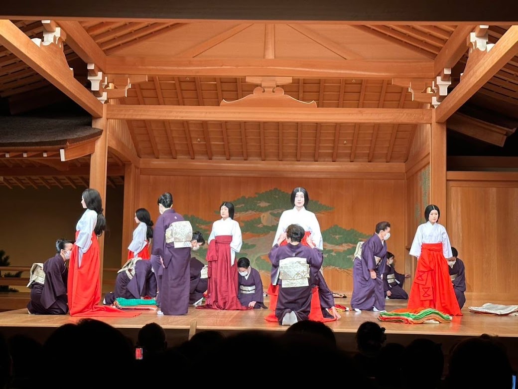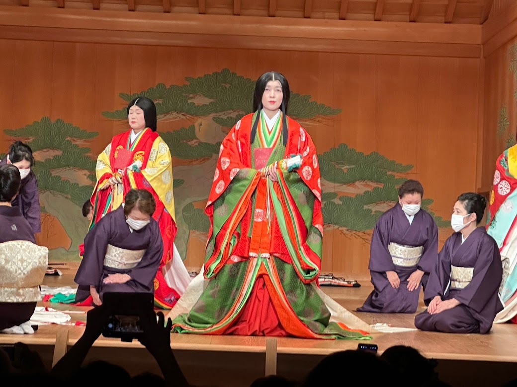 最初は白い着物に赤い袴で登場した女性が、一枚ずついろいろな色の上着を重ねて着させられていく様を説明を聞きながら見ていくのです。朱に近い赤の袴は既婚女性、濃い赤の袴は未婚女性が着るのだそうです。