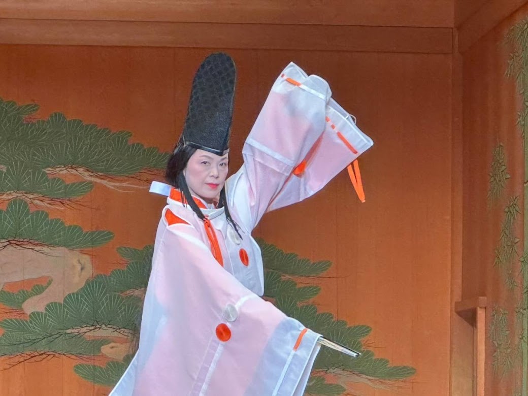 この講演会では、十二単以外の様々な衣装の着付けなども実演されました。源義経が愛した巴御前が着ていた白拍子の衣装もあり、ほんの少しですが白拍子の舞も披露されたことも興味深いものでした。