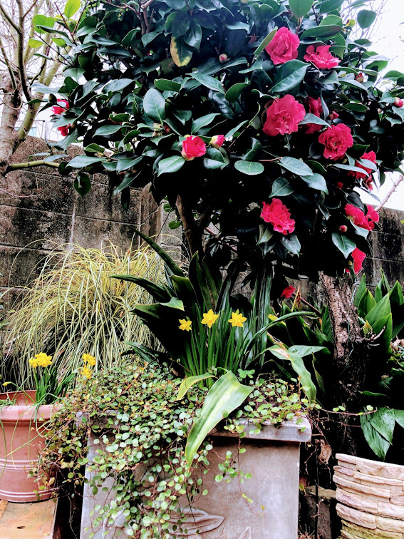 それでも3月の声を聞き2,3日雨が降ったので、ようやく花が咲き始めました。遅咲きの山茶花と黄水仙が白黒の世界に色づけして、裏庭に春の訪れを知らせてくれました。