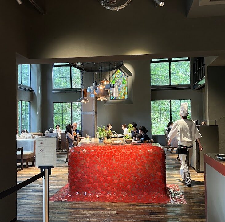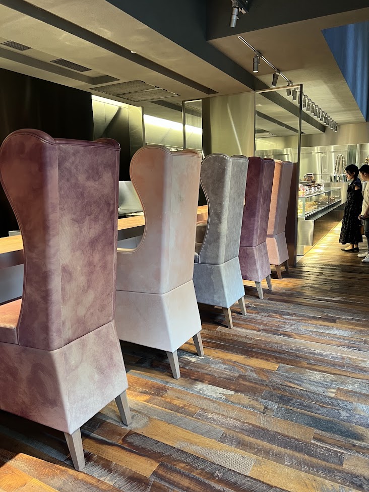 因みに、カフェスペースの手前にすごいゴージャスな背もたれの椅子が並んだカウンターがあります。ここは予約制の特別スウィーツを、パティシエが目の前で作ってくれるコーナーだそうで、五千円くらいで数点提供されるスウィーツコースを食べられるそうです。