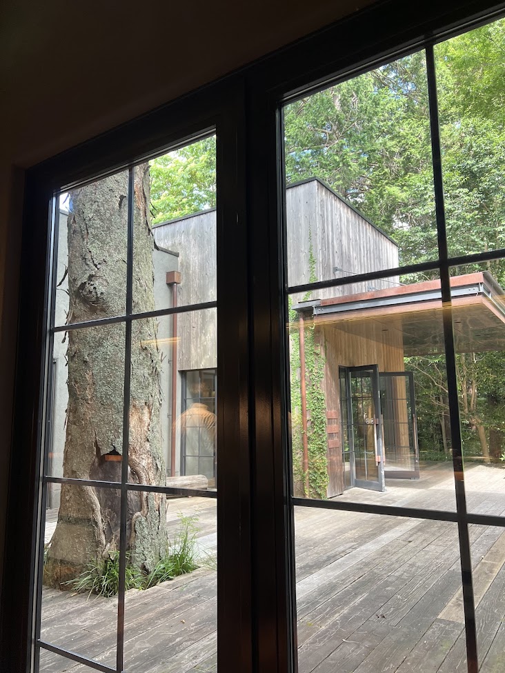 八日市市にもあるというので行ってみると、駐車場の向こうには大きな木々がうっそうと茂り店舗が見えません。森の中の小道を行くとシックな板張りの店が見えてきます。