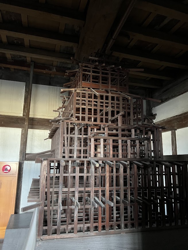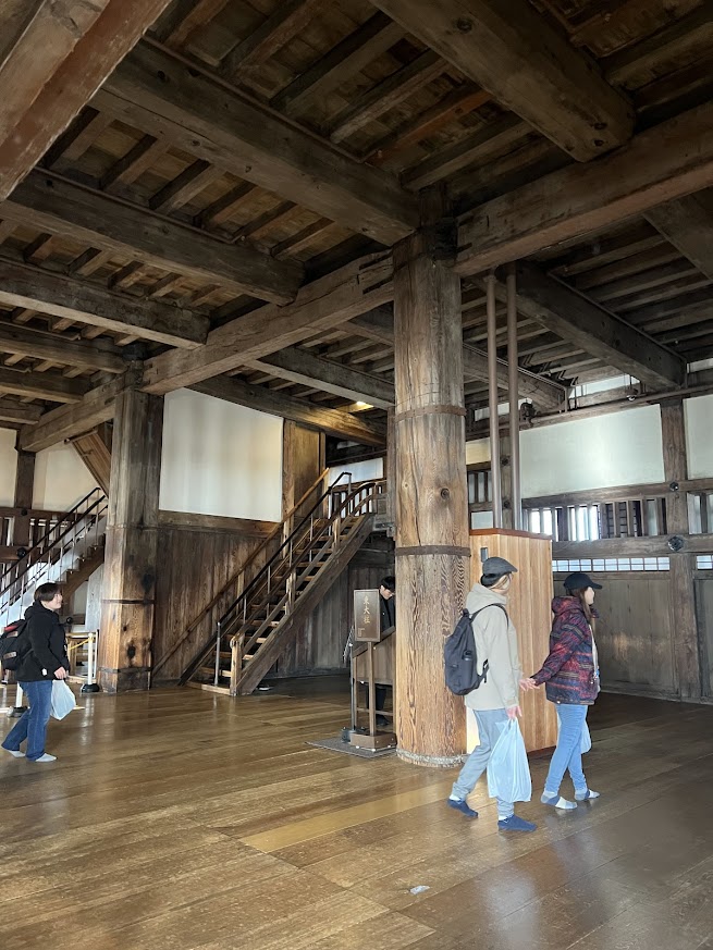 城内は、一階から六階まで階段を上っていくのですが、二十数メートルもの長さの東西二本の大柱が下から上まで突き抜けています。昭和の大修理で柱の歪みを直したそうですが、こんな大きな城を二本の柱で支えているなんて、すごい技術だなあと感心します。